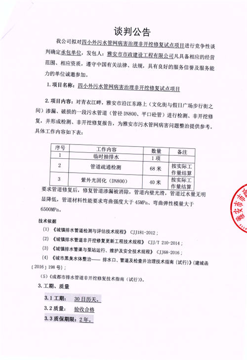四小外污水管網病害治理非開挖修復試點項目競爭性談判公告(市政公司)
