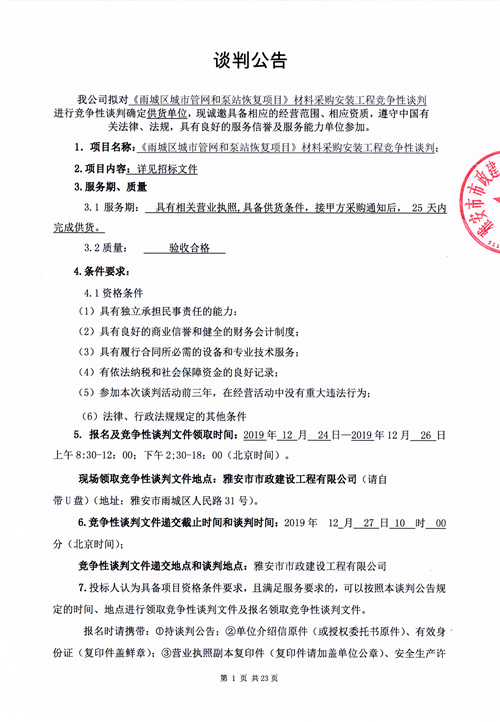 《雨城區(qū)城市管網(wǎng)和泵站恢復(fù)項(xiàng)目》材料采購(gòu)安裝工程競(jìng)爭(zhēng)性談判公告