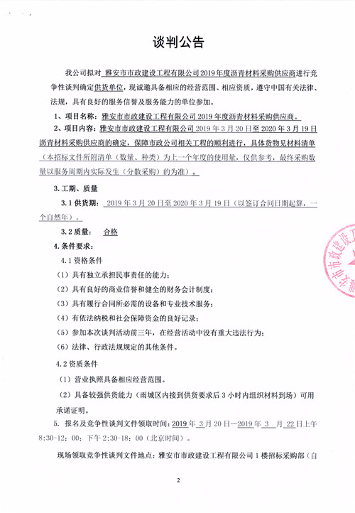 市政公司2019年度瀝青采購供應商競爭性談判公告