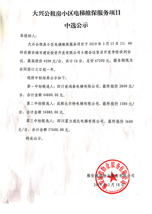 大興公租房小區(qū)電梯維護(hù)服務(wù)項目中選公示