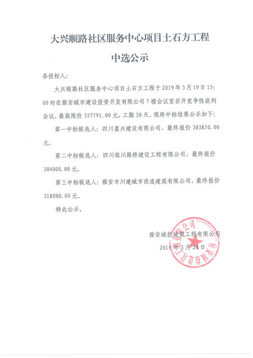 大興順路社區(qū)服務(wù)中心土方工程競爭性談判中選公示