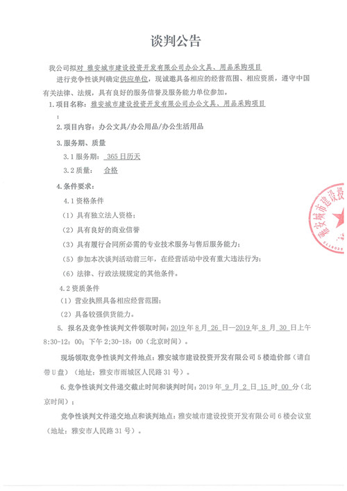 雅安城市建設(shè)投資開發(fā)有限公司辦公文具、用品采購項(xiàng)目競(jìng)爭性談判公告(第二次)