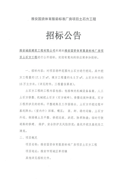 城投建工公司雅安國資體育服裝標(biāo)準(zhǔn)廠房項(xiàng)目土石方工程招標(biāo)公告