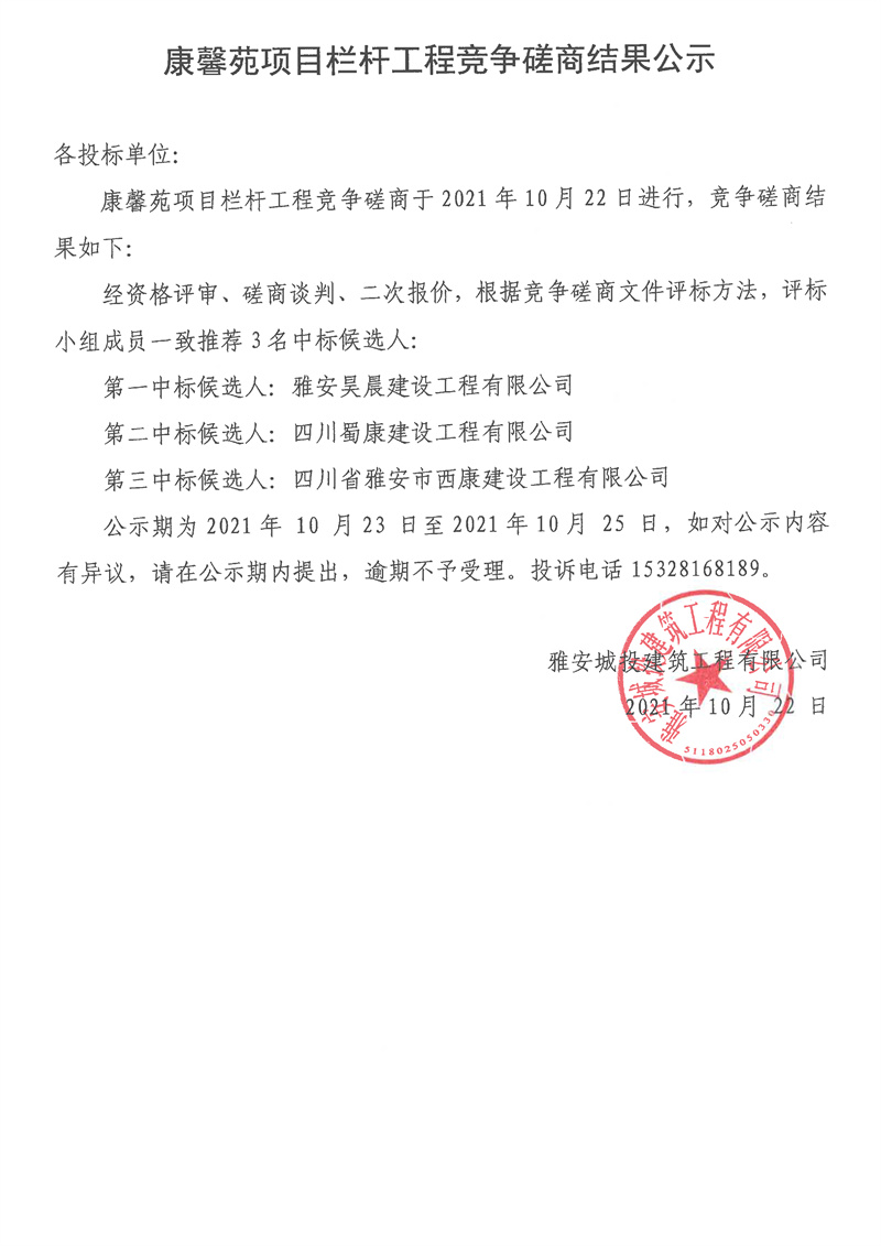 康馨苑項(xiàng)目欄桿工程競爭磋商結(jié)果公示