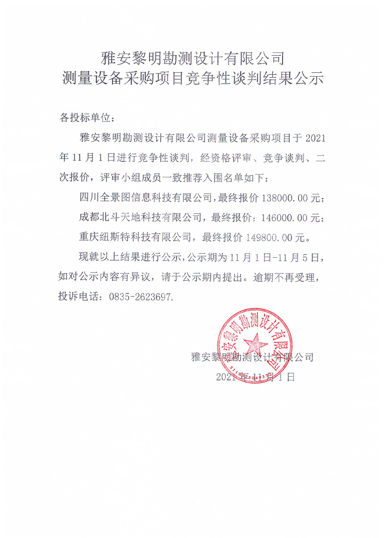 雅安黎明勘測設(shè)計有限公司測量設(shè)備采購競爭性談判結(jié)果公示