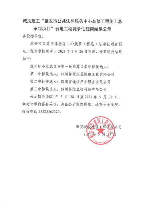 城投建工公司雅安市公共法律服務(wù)中心裝修工程施工總承包項(xiàng)目弱電工程競(jìng)爭(zhēng)性磋商結(jié)果公示
