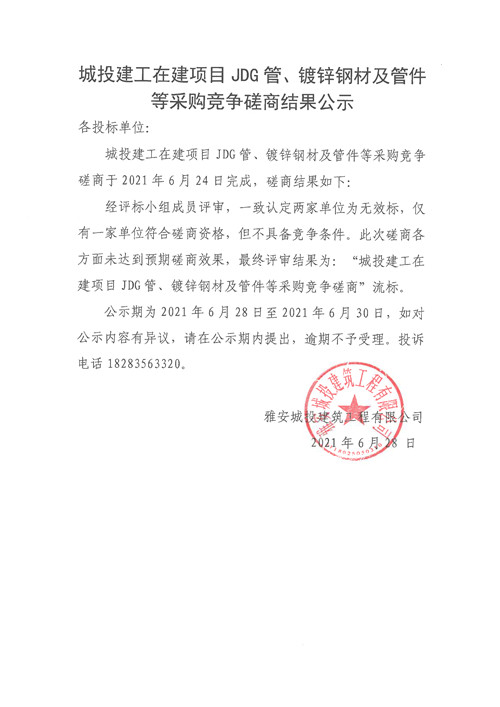 城投建工公司在建項(xiàng)目JDG管、鍍鋅鋼材及管件等采購(gòu)競(jìng)爭(zhēng)性磋商結(jié)果公示