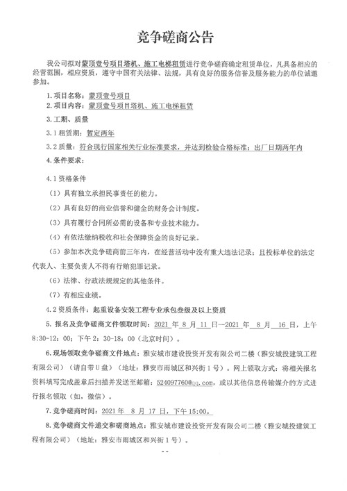 城投建工公司蒙頂壹號(hào)項(xiàng)目塔機(jī)、施工電梯租賃競(jìng)爭(zhēng)磋商公告