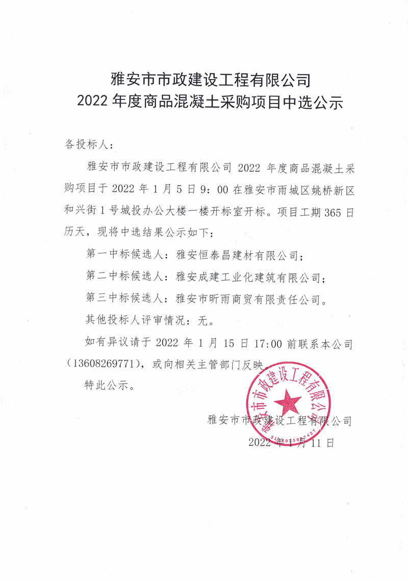 雅安市市政建設(shè)工程有限公司2022年度商品混凝土采購項目中選公示