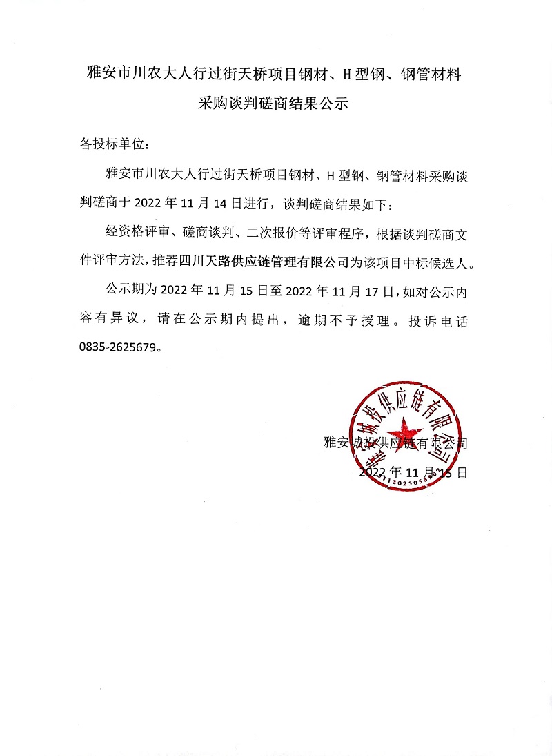 雅安市川大人行過街天橋項目鋼材、H型鋼、鋼管材料采購談判磋商結(jié)果公示
