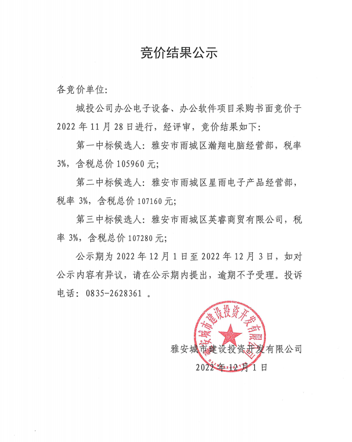雅安城市建設(shè)投資開發(fā)有限公司辦公電子設(shè)備、辦公軟件項目采購競價結(jié)果公示