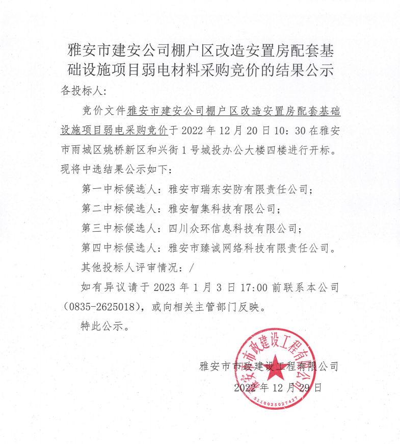 雅安市建安公司棚戶區(qū)改造安置房配套基礎(chǔ)設(shè)施項(xiàng)目弱電材料采購競價(jià)結(jié)果公示