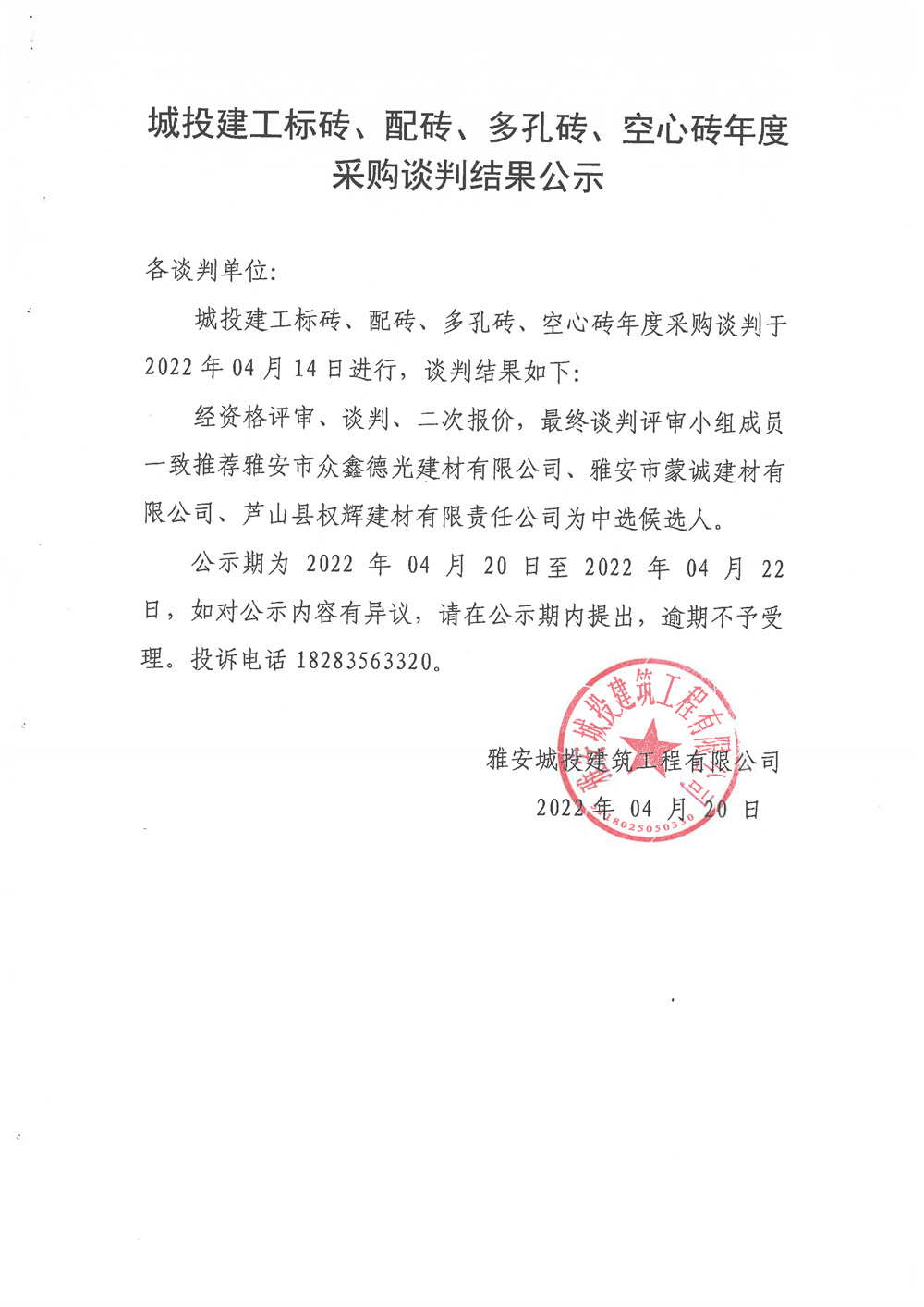 城投建工標(biāo)磚、配磚、多孔磚、空心磚年度采購(gòu)競(jìng)爭(zhēng)性談判結(jié)果公示