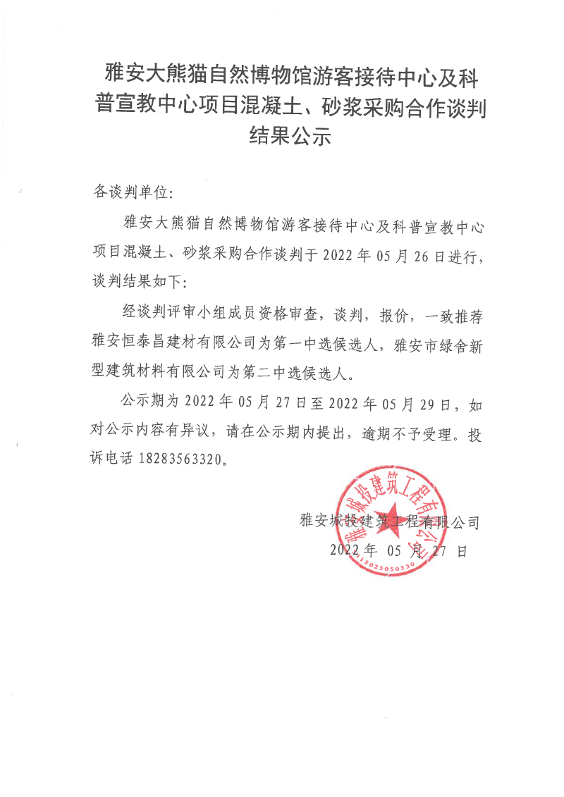 雅安大熊貓自然博物館游客接待中心及科普宣教中心項目混凝土、砂漿采購合作談判結果公示