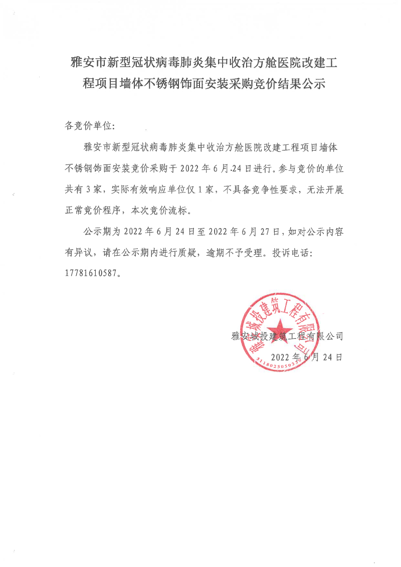 雅安市新型冠狀病毒肺炎集中收治方艙醫(yī)院改建工程項(xiàng)目墻體不銹鋼飾面安裝采購(gòu)競(jìng)價(jià)結(jié)果公示