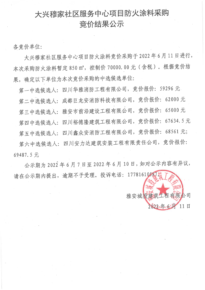 大興穆家社區(qū)服務中心項目防火涂料采購競價結果公示