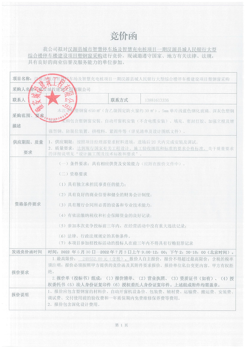 漢源縣城市智慧停車場及智慧充電樁項(xiàng)目一期漢源縣城人民銀行大型綜合樓停車樓建設(shè)項(xiàng)目塑鋼窗采購競價(jià)公告