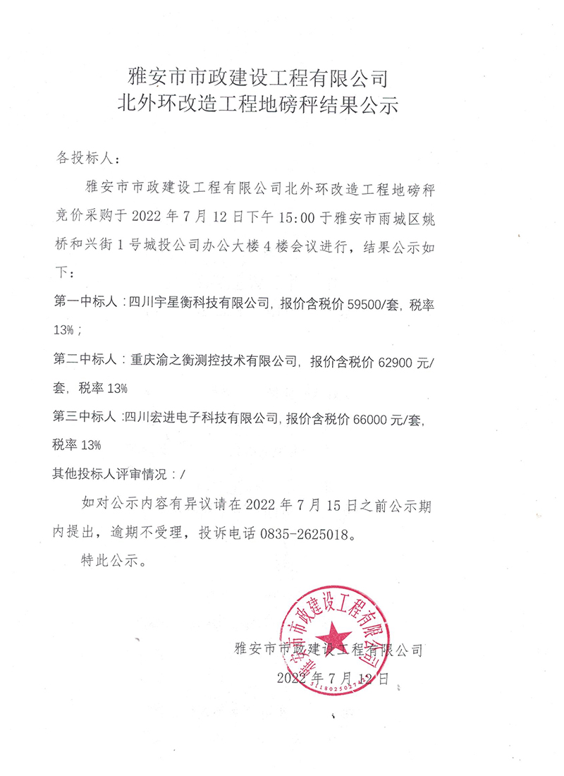 雅安市北外環(huán)改造工程地磅秤詢價結果公示