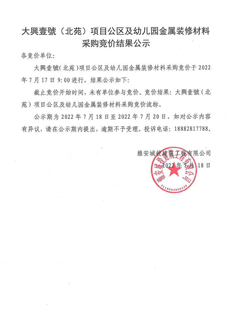 大興壹號(hào)(北苑)項(xiàng)目公區(qū)及幼兒園金屬裝修材料采購競(jìng)價(jià)結(jié)果公示