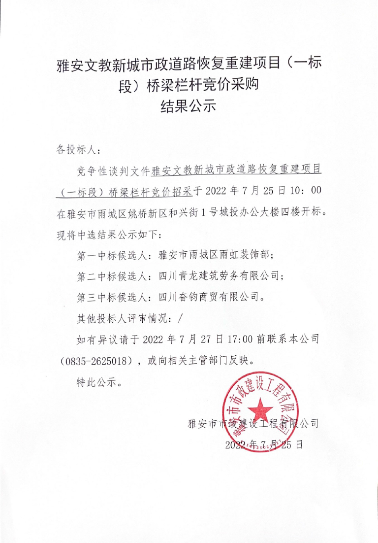 雅安文教新城市政道路恢復 重建項目競價(一標段)橋梁欄桿競價采購結果公示