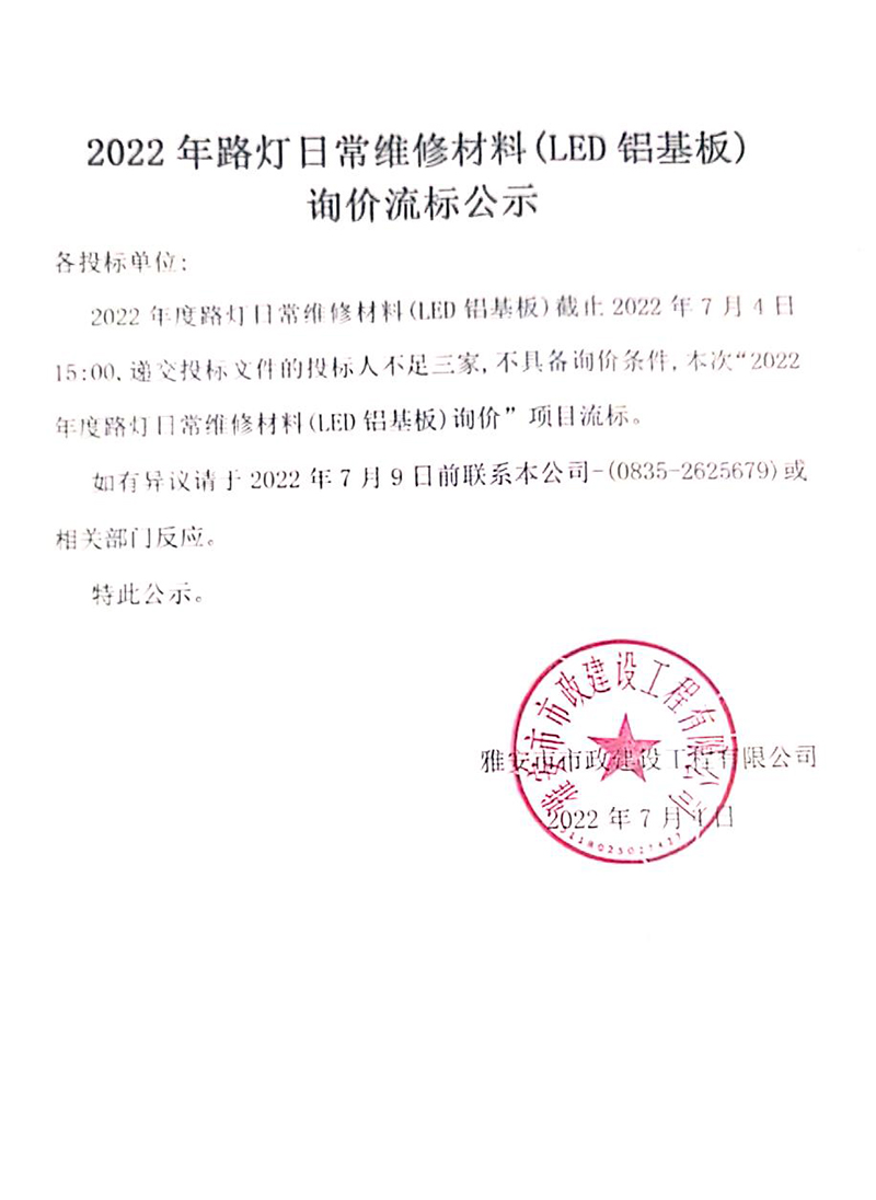 2022年路燈日常維修材料(LED鋁基板)詢價流標(biāo)公示