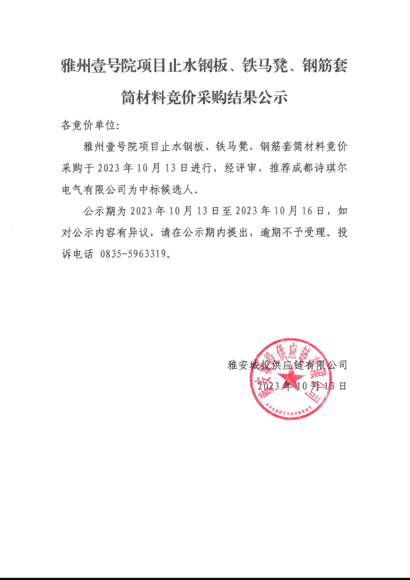 雅州壹號(hào)院項(xiàng)目止水鋼板、鐵馬凳、鋼筋套筒材料競(jìng)價(jià)采購(gòu)結(jié)果公示