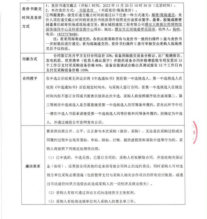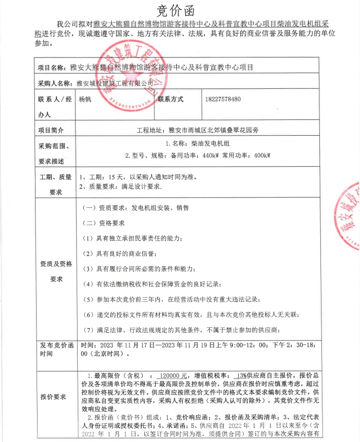 雅安大熊貓自然博物館游客接待中心及科普宣教中心項目柴油發(fā)電機(jī)組采購競價公告