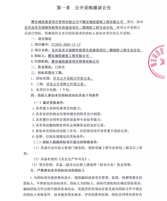 寶興縣靈關(guān)保障性租賃住房建設(shè)項(xiàng)目二期消防工程專業(yè)分包公開采購邀請公告