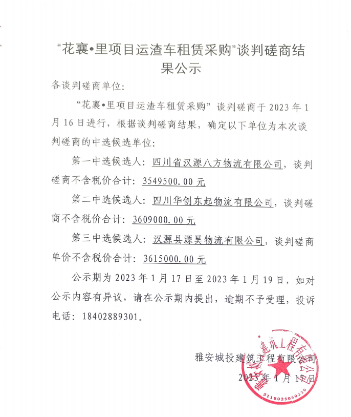 花襄·里項目運渣車租賃采購談判磋商結果公示