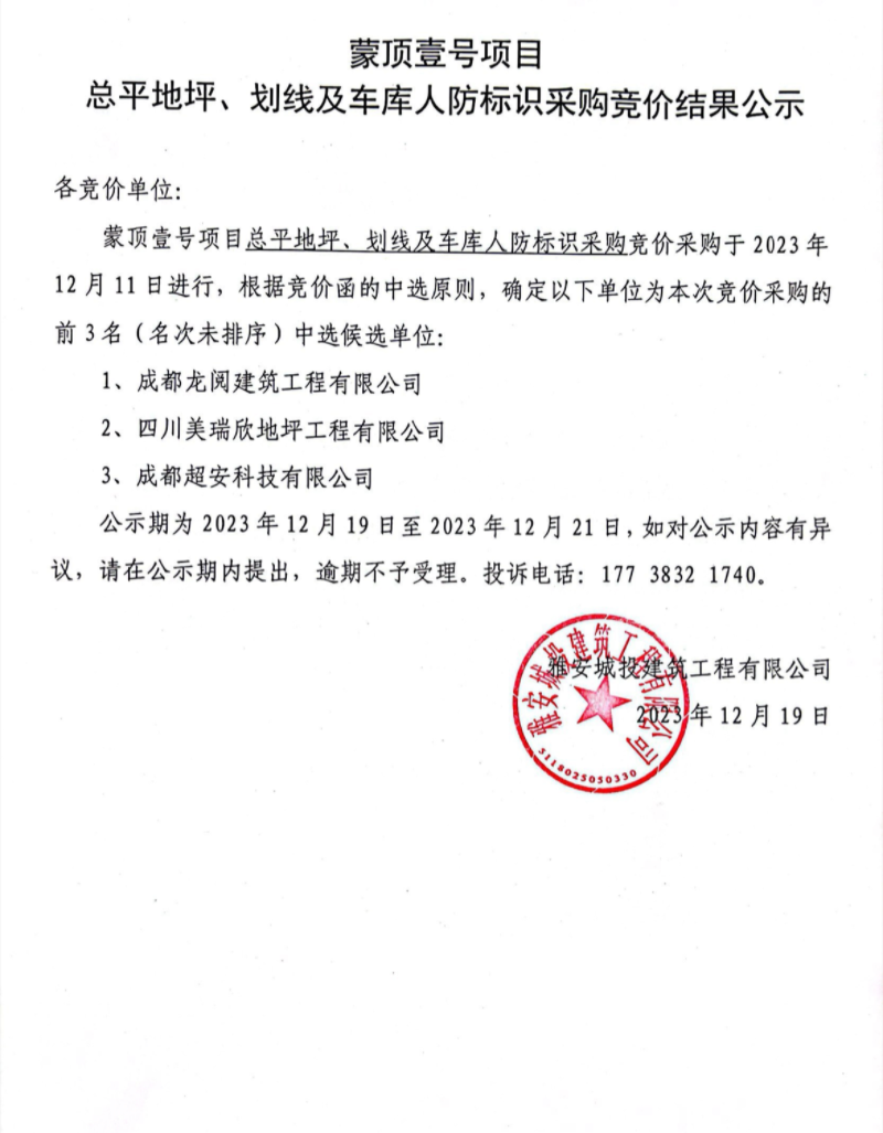 蒙頂壹號項目總平地坪、劃線及車庫人防標識采購競價結果公示