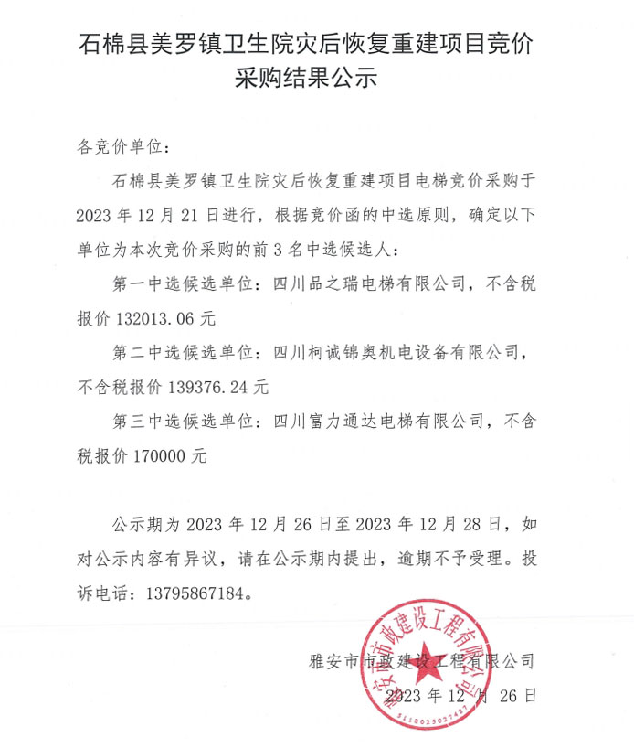 石棉縣美羅鎮(zhèn)衛(wèi)生院災(zāi)后恢復(fù)重建項(xiàng)目競價采購結(jié)果公示