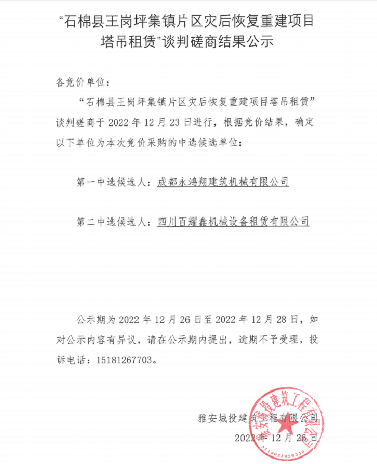“石棉縣王崗坪集鎮(zhèn)片區(qū)災(zāi)后恢復(fù)重建項(xiàng)目塔吊租賃”談判磋商結(jié)果公示