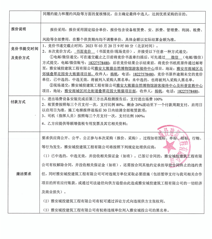 雅安大熊貓自然博物館游客接待中心及科普宣教中心項(xiàng)目施工升降機(jī)租賃采購(gòu)競(jìng)價(jià)公告