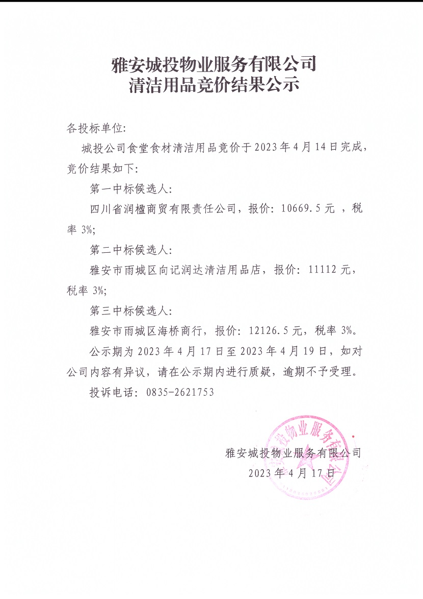 雅安城投物業(yè)服務(wù)有限公司清潔用品競價結(jié)果公示