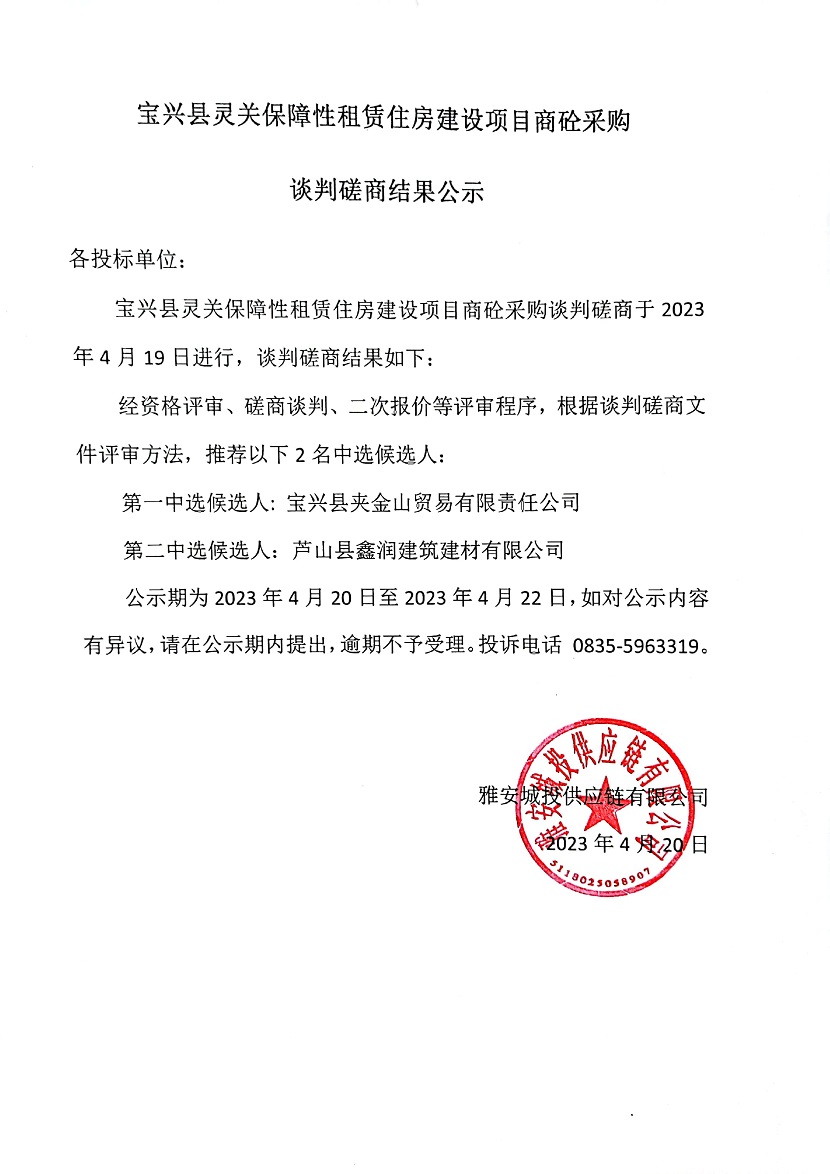 寶興縣靈關(guān)保障性租賃住房建設(shè)項(xiàng)目商砼采購(gòu)談判磋商結(jié)果公示