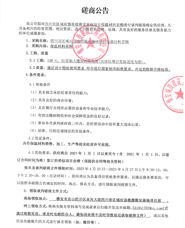 四川省區(qū)域應(yīng)急救援雅安基地項(xiàng)目保溫材料采購談判磋商公告