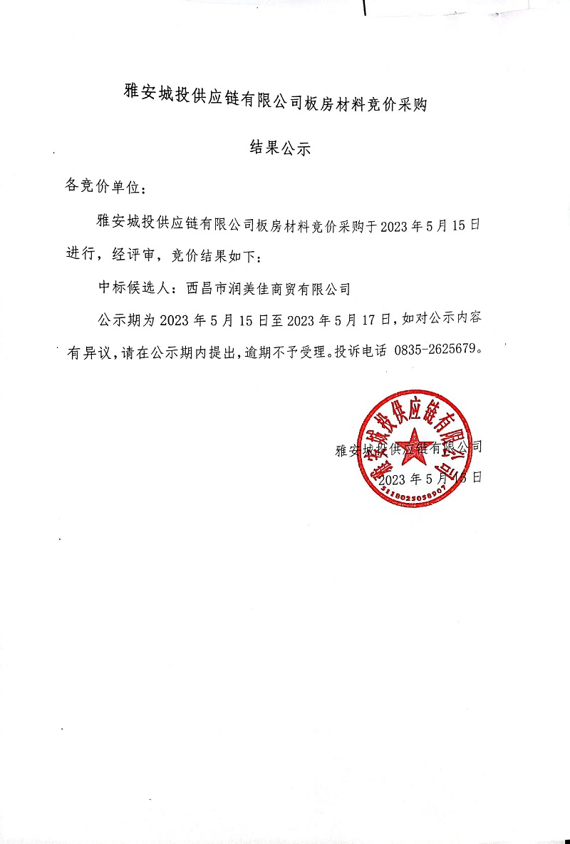 雅安城投供應(yīng)鏈有限公司板房材料競(jìng)價(jià)采購(gòu)結(jié)果公示