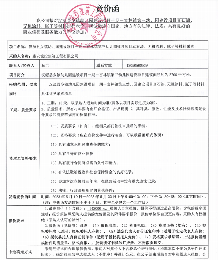 漢源縣鄉(xiāng)鎮(zhèn)幼兒園建設(shè)項目一期一富林鎮(zhèn)第三幼兒園建設(shè)項目真石漆、無機(jī)涂料、膩子等材料采購競價公告