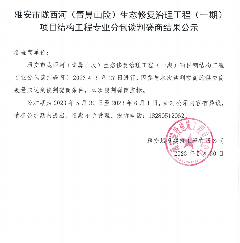 雅安市隴西河(青鼻山段)生態(tài)修復(fù)治理工程(一期)項(xiàng)目鋼結(jié)構(gòu)工程專(zhuān)業(yè)分包談判磋商結(jié)果公示