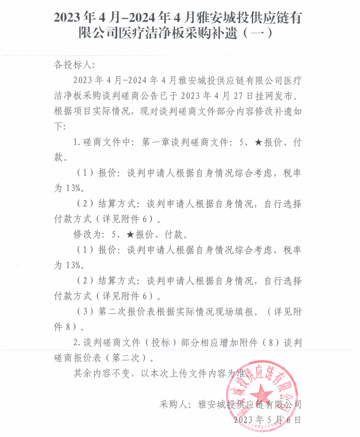 2023年4月-2024年4月雅安城投供應(yīng)鏈有限公司醫(yī)療潔凈板采購補遺(一)