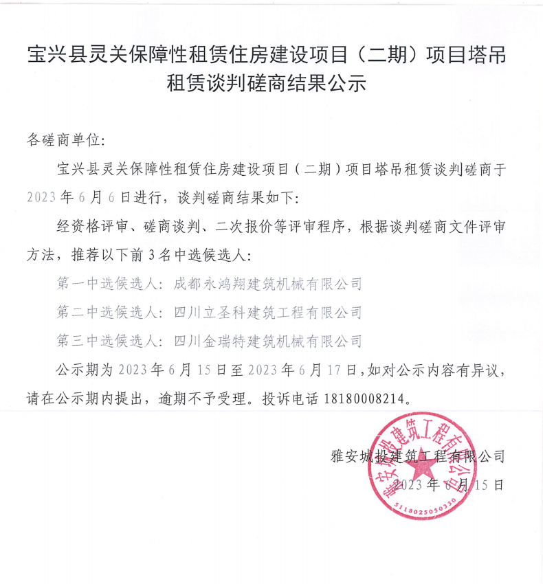 寶興縣靈關保障性租賃住房建設項目(二期)項目塔吊租賃談判磋商競價結(jié)果公示