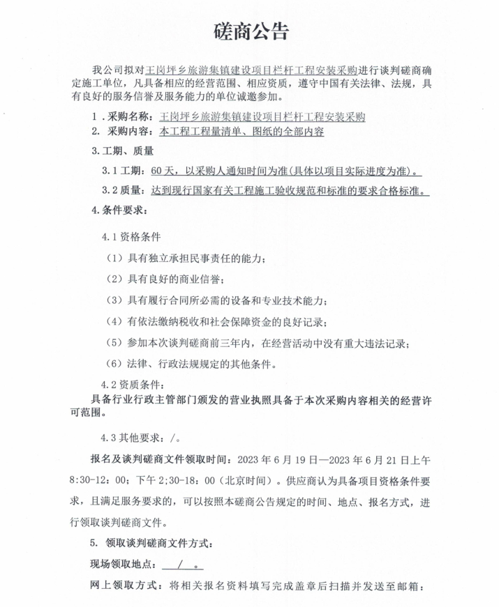 王崗坪鄉(xiāng)旅游集鎮(zhèn)建設(shè)項(xiàng)目欄桿工程安裝采購(gòu)談判磋商公告