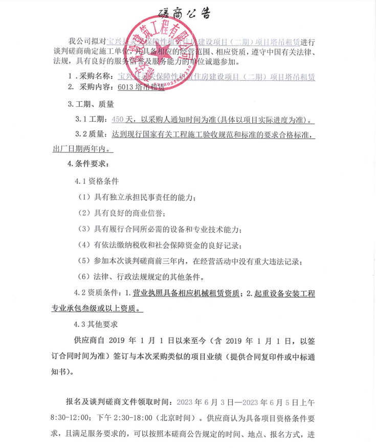 寶興縣靈關保障性租賃住房建設項目(二期)項目塔吊租賃談判磋商公告