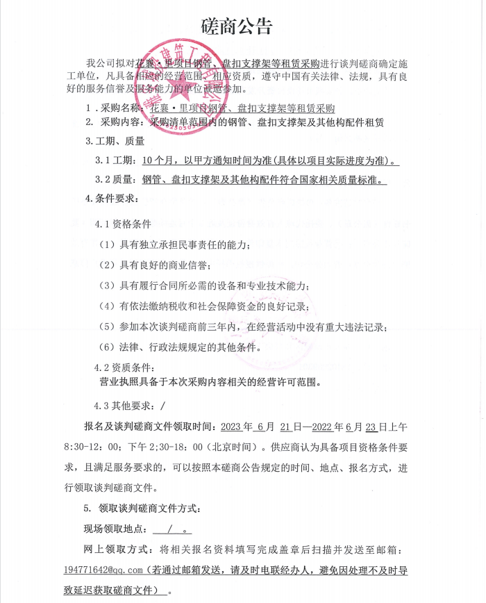 花襄·里項(xiàng)目鋼管、盤(pán)扣支撐架等租賃采購(gòu)談判磋商公告