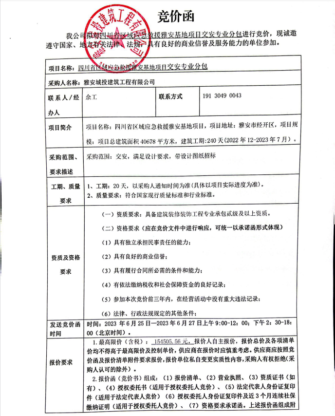 四川省區(qū)域應(yīng)急救援雅安基地項(xiàng)目交安專業(yè)分包競(jìng)價(jià)公告
