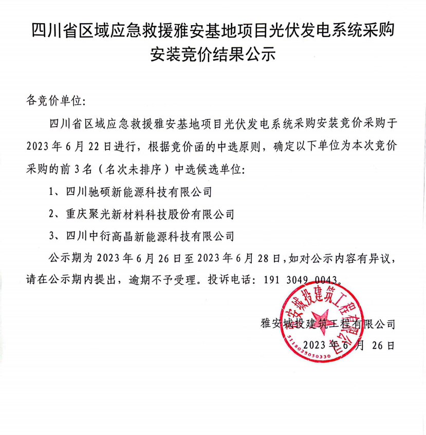 四川省區(qū)域應急救援雅安基地項目光伏發(fā)電系統(tǒng)采購安裝競價結果公示