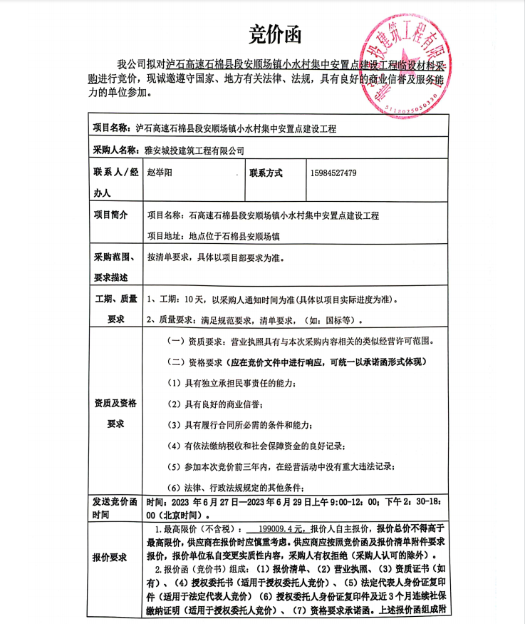 瀘石高速石棉縣段安順場鎮(zhèn)小水村集中安置點建設工程臨設材料采購競價公告