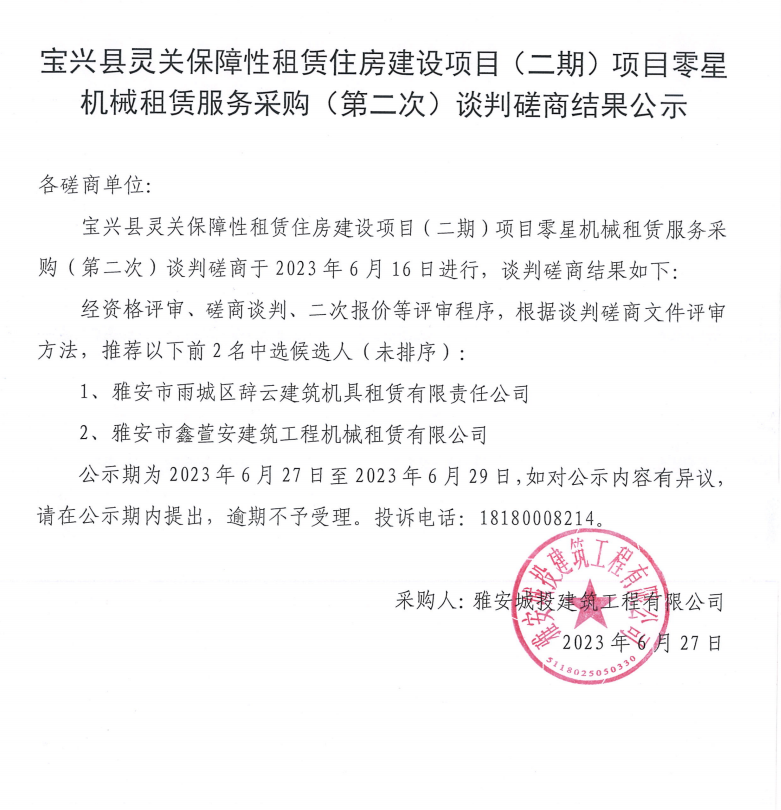 寶興縣靈關(guān)保障性租賃住房建設(shè)項(xiàng)目(二期)項(xiàng)目零星機(jī)械租賃服務(wù)采購(gòu)(二次)談判磋商結(jié)果公示