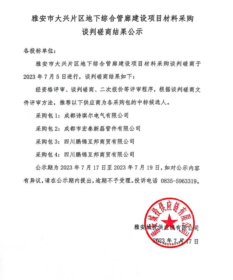 雅安市大興片區(qū)地下綜合管廊建設(shè)項(xiàng)目材料采購(gòu)談判磋商結(jié)果公示