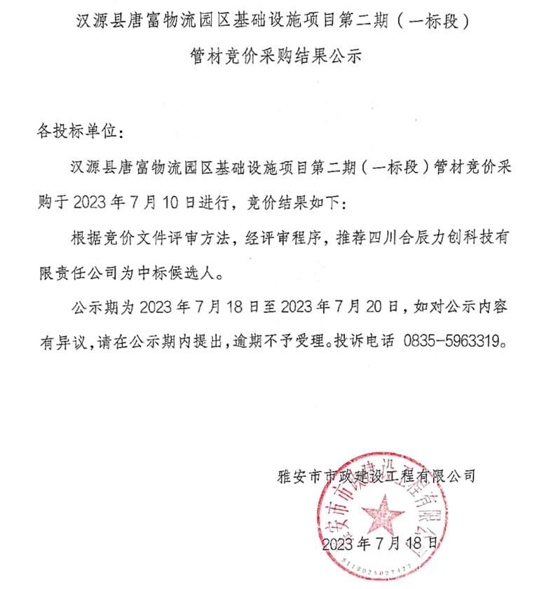 漢源縣唐富物流園區(qū)基礎(chǔ)設(shè)施項(xiàng)目二期(一標(biāo)段)管材競(jìng)價(jià)采購(gòu)結(jié)果公示